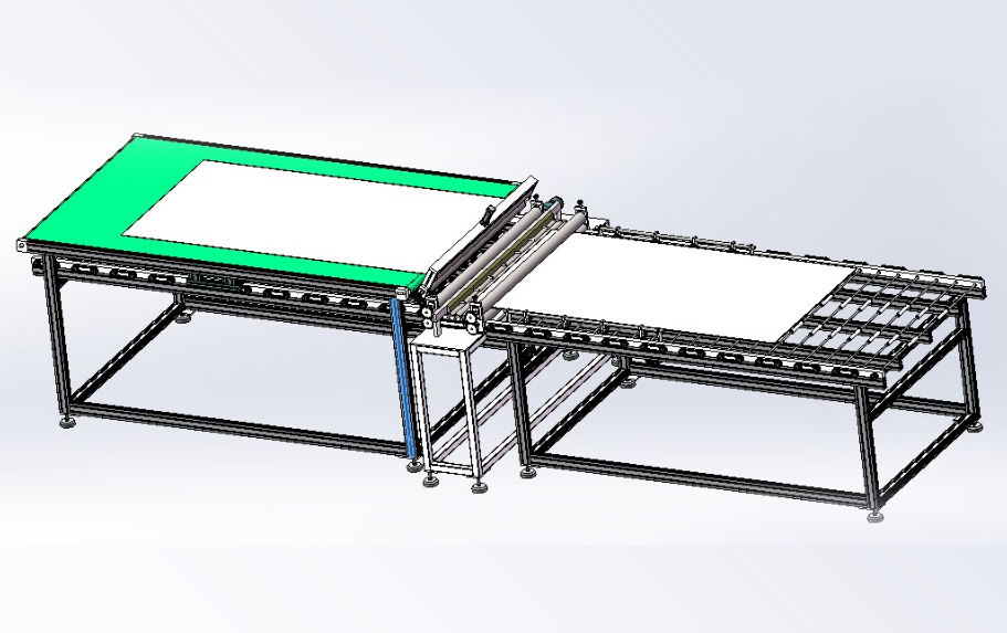 本生產(chǎn)線依據(jù)用戶需求,進(jìn)行“量身”設(shè)計,由層壓前鋪設(shè)傳輸線;通過不同機(jī)構(gòu)的傳輸、轉(zhuǎn)運、變向、定位、旋轉(zhuǎn)/釋放實現(xiàn)組件封裝過程的流水化操作,可提高單位組件生產(chǎn)效率。